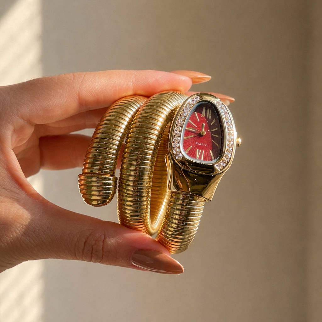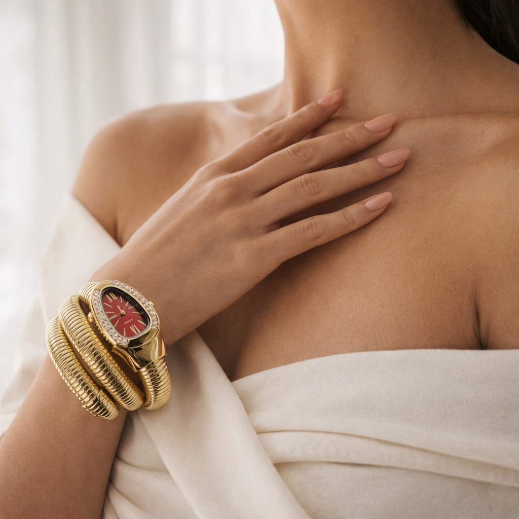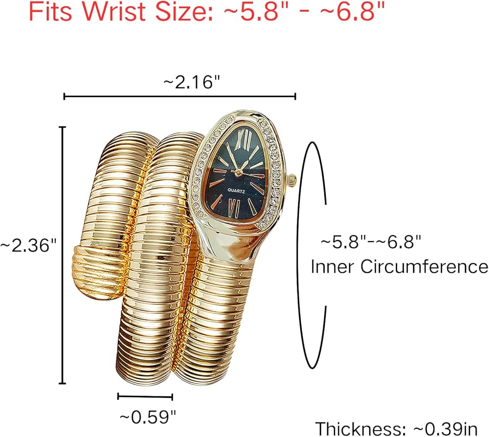 - Unique snake-inspired wrap style for a classy, high-fashion look.