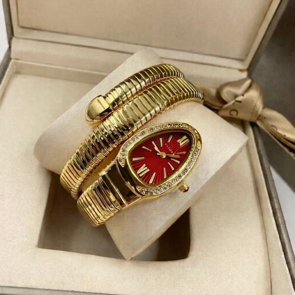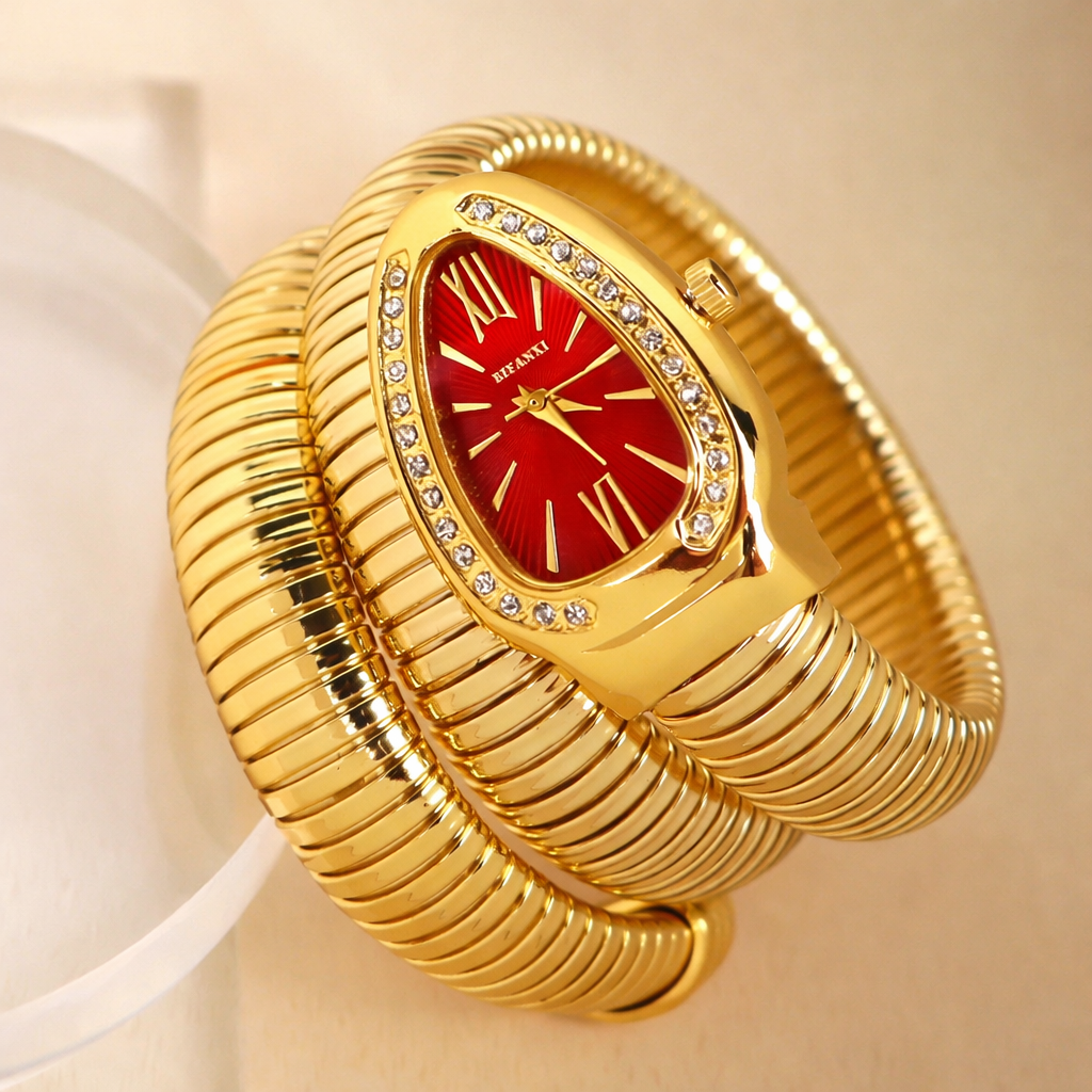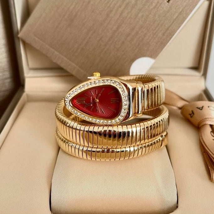 - Elegant gold coil bracelet watch with a bold, luxury statement design.