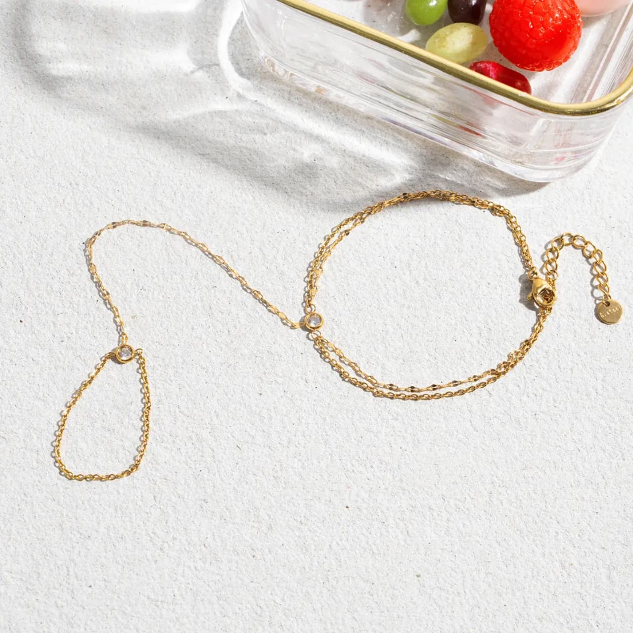 - Elegant gold hand chain with a double-layered wrist chain