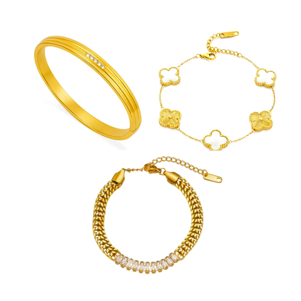 • Premium stainless steel bracelet with rich gold plating, featuring signature screw motifs and sparkling accents for a timeless, luxurious look.