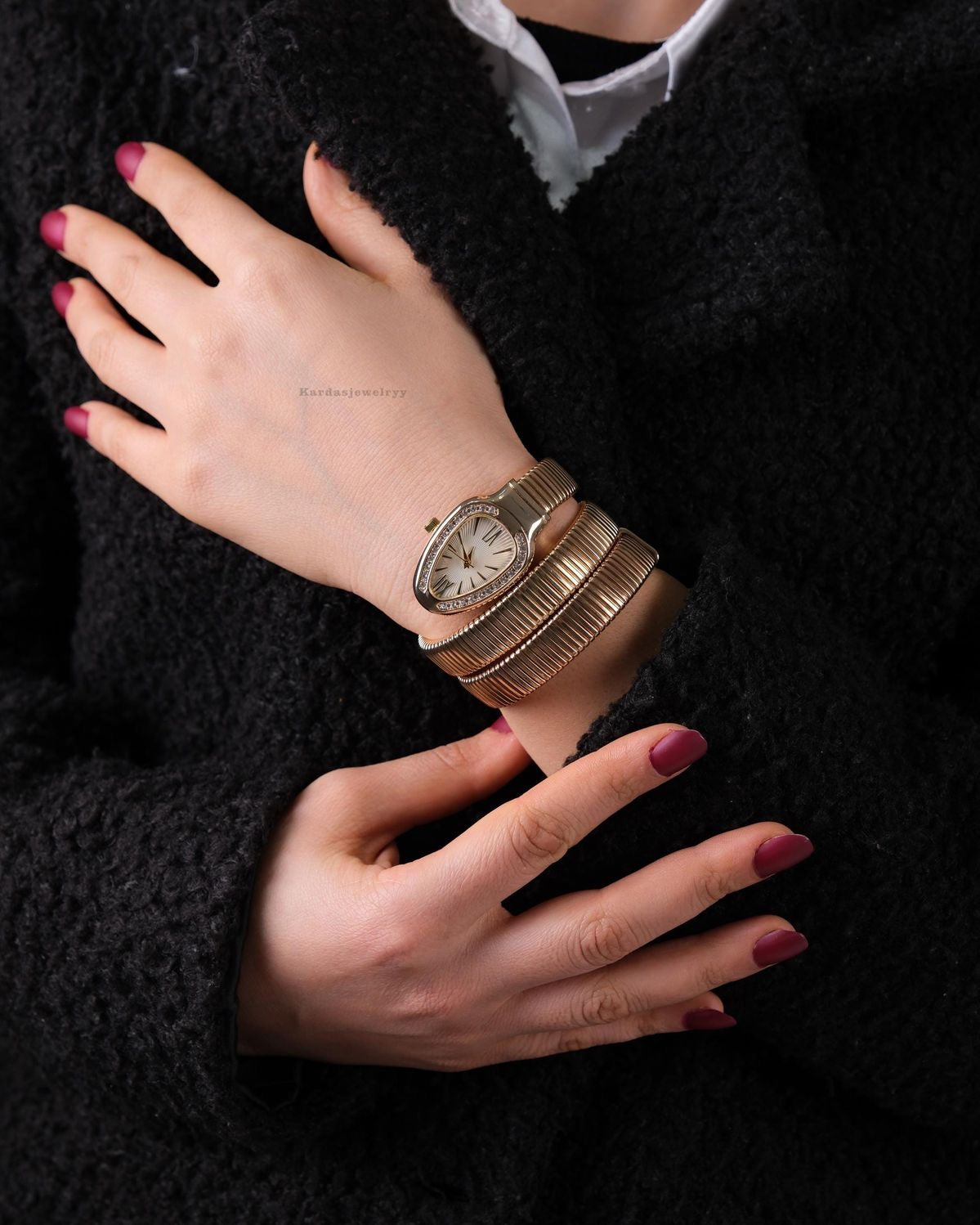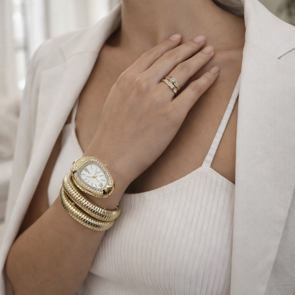 - Unique snake-inspired wrap style for a classy, high-fashion look.