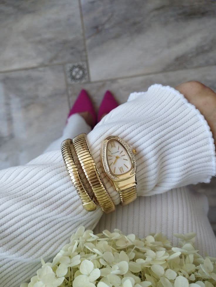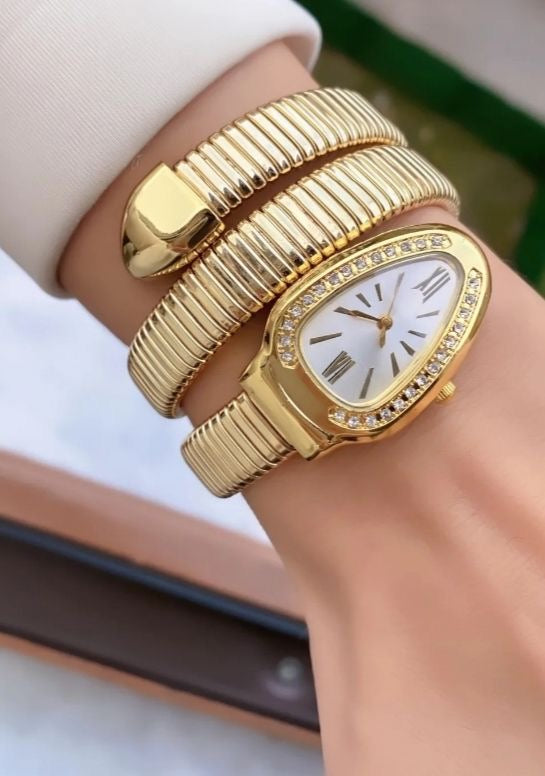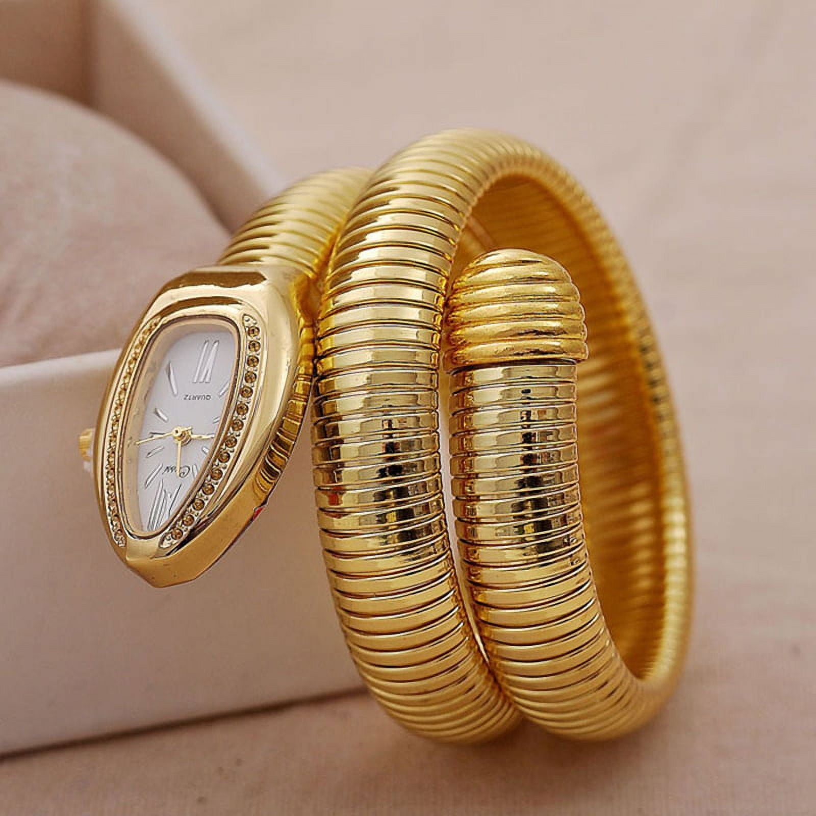 - Elegant gold coil bracelet watch with a bold, luxury statement design.
